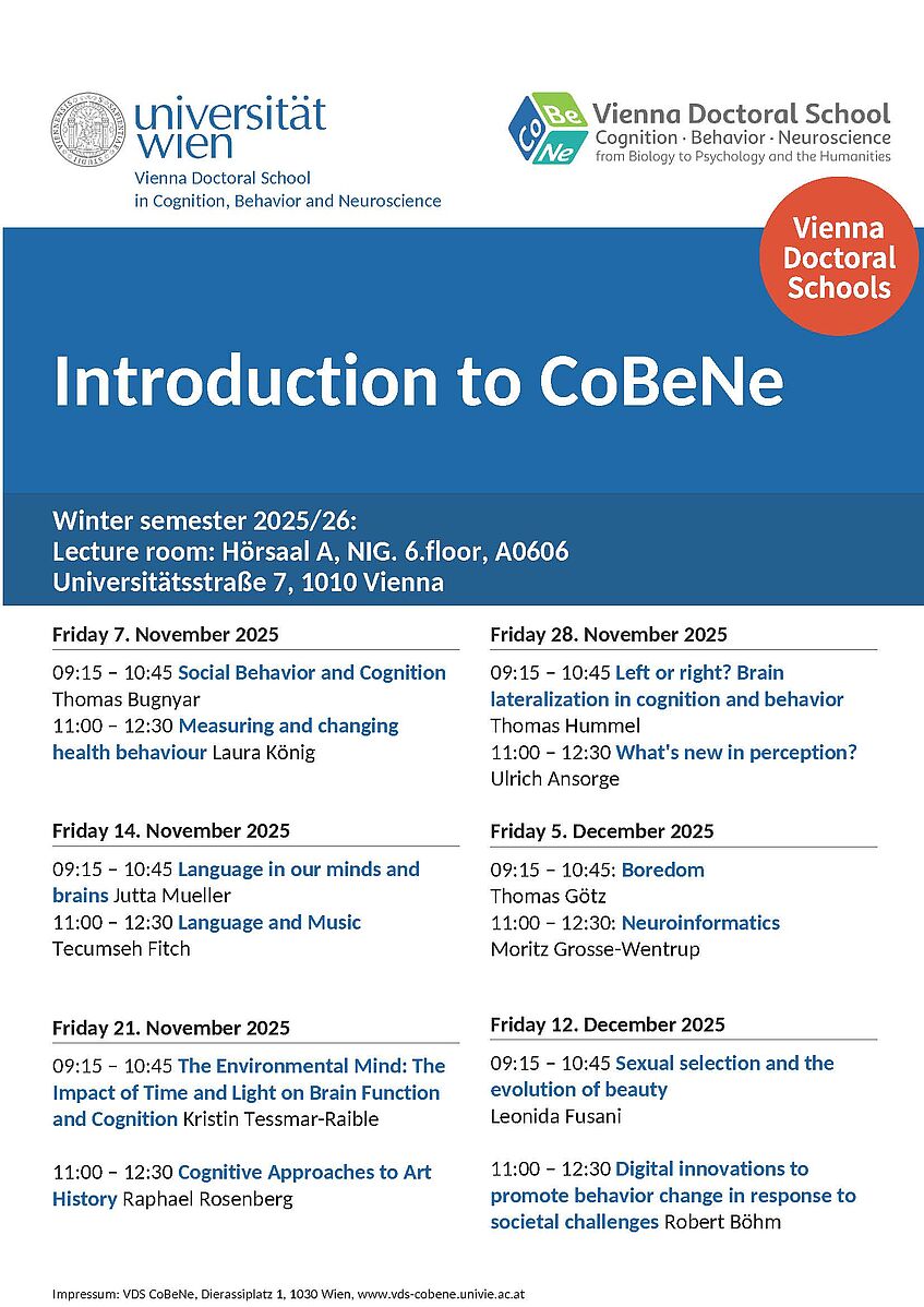 The learning outcome shall be i) knowledge about the CoBeNe disciplines at University Vienna and ii) awareness of the current research foci and methods used. iii) enhance cohort and peer group building, fostering deeper connections, collaboration, and a supportive learning culture among participants. Interdisciplinary thinking will be fostered by raising awareness for similarities and differences in the conceptual and methodological approaches within and between disciplines.